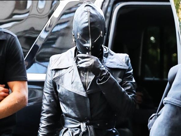 Kim je odabrala "Balensijaga" odevni komad od crne kože sa maskom preko lica, koja ima rajsferšluse preko lica, a pozadi rupu da bi mogla da provuče kosu.