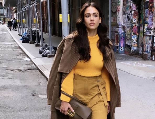Džesika je obukla široke pantalone i kratki džemper u dve različite nijanse žute, kaput, cipele i tašnu braon boje koja je vrlo popularna za ovu jesen. Posebnu pažnju privukle su cipele, koje nisu "fensi" i ženstvene već su najobičnije braon "cokule".