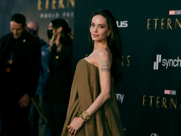 Anđelina igra u novom superherojskom filmu i odlučila se za neobičan stajling - obukla je smeđu, dugu haljinu bez bretela a nakit je izazvao mnogo pažnje!