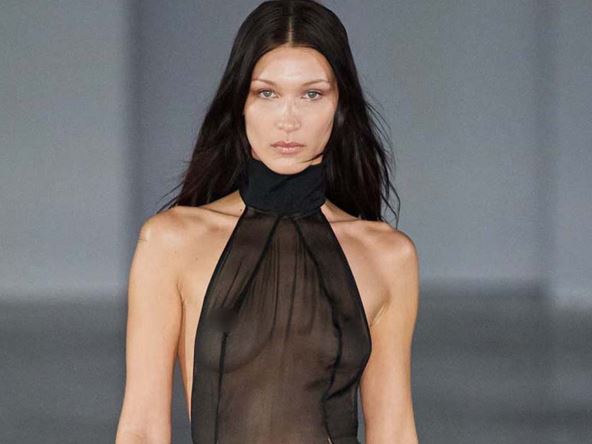 Ona je na reviji dizajnera Ludovika de San Sernina prošetala u crnoj, prozirnoj haljini, ispod koje nije nosila brushalter! Providna toaleta ima samo komad neprozirne crne tkanine koja je sakrila Belino međunožje, dok ju je sva publika slikala otpozadi, dok je šetala gole zadnjice.