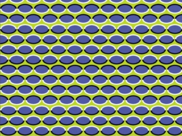 Na zelenoj pozadini se nalaze redovi plavih krugova koji su oivičeni belim i crnim polukrugovima koji čine povezanu celinu.  Na prvi pogled, izgleda da se središnji deo krugova pomera, takoreći talasa... Ali da li je zaista tako?