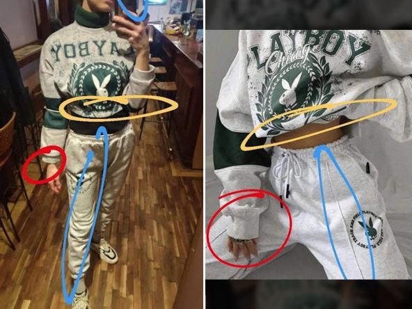 Na slici mogu se videti razlike između fotografije trenerke objavljene na jednoj Instagram stranici i stvarnog izgleda uživo. Razlike postoje kako u materijalu, tako i u šavovima na tkanini i u boji.