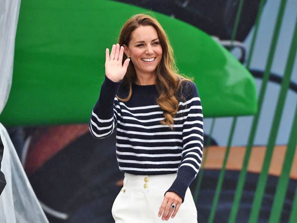 Uz pomoć crnog džempera sa belim prugama, koji je potpuno zatvoren, vojvotkinja je uspela da zadrži smeran i ležeran izgled, a uz to je nosila puštenu kosu koja je bila blago uvijena.