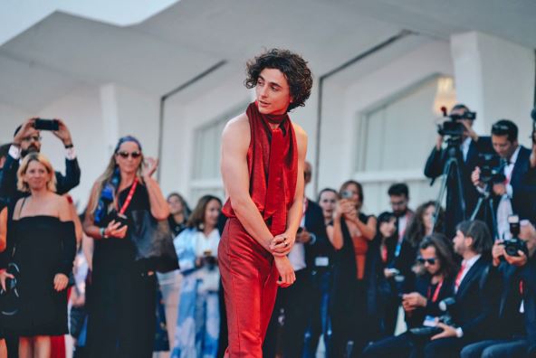 Timoti se sada pojavio na 29. Filmskom festivalu u Veneciji i napravio opštu pometnju. Umesto svečanog odela, glumac je obukao crvene pantalone i maramu koja jednim delom podseća na kravatu. Ipak, kada se okrenuo, fotoreporteri su neumorno škljocali gola leđa, a on je sa zadovoljstvom pozirao sa svojim koleginicama.