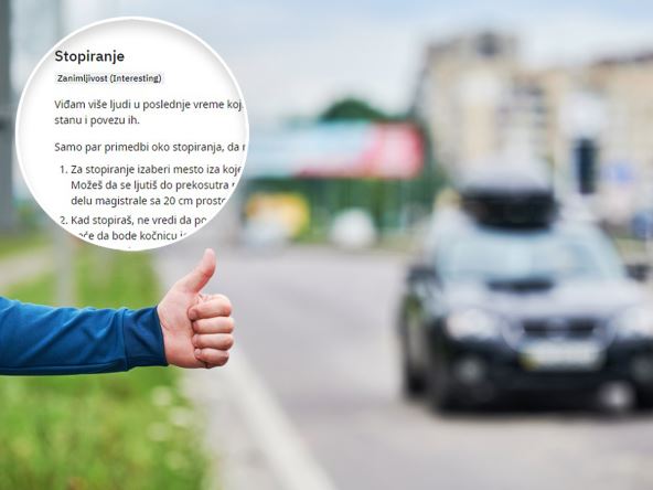 - Kad stopiraš, ne vredi da podigneš palac tri sekunde pre nego što vozilo stigne do tebe. Prvo, niko neće da stisne kočnicu jer si ti digao palac na prepad, a osim toga, to pokazuje da ti se baš i ne mili da stopiraš, verovatno ti nije ni bitno, nego samo pokušavaš da prekratiš vreme dok ne dođe autobus.