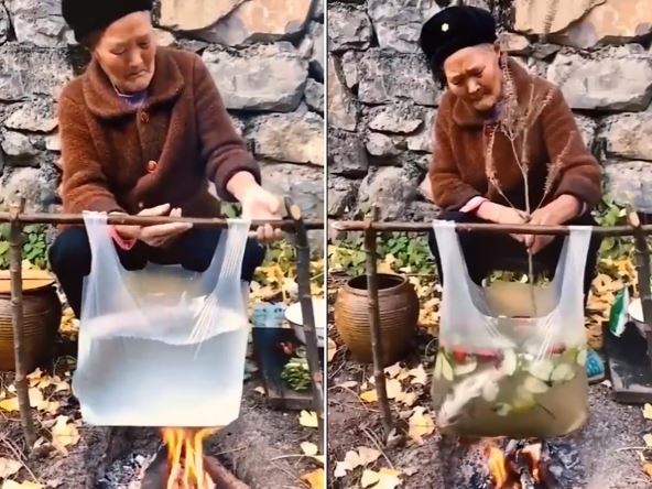 Ono što se može videti na videu jeste starija baka, očigledno po fizičkim karakteristikama, poreklom sa Azijskog podneblja, koja kuva čorbu od ribe u plastičnoj kesi i to na nimalo slaboj vatri. Kesu je napunila vodom skoro do vrha, a zatim postepeno dodavala namirnice, različite začine, ali i celu ribu. Ono što je najviše začudilo mnoge jeste kako kesa nije pukla od toplote. Čak se i nakon izvesnog vremena moglo videti kako voda počinje polako da ključa.