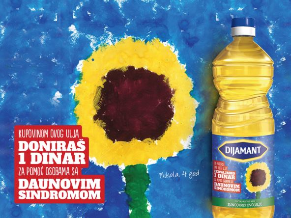 I ove godine će se na policima naći milion i dvesta hiljada flaša Dijamant ulja, sa posebno oslikanom etiketom, čijom kupovinom svi postajemo aktivni učesnici kampanje ,,Prati suncokret”. Od svake kupljene boce, po jedan dinar biće odvojen i doniran Savezu udruženja za pomoć osobama sa Daunovim sindromom.
