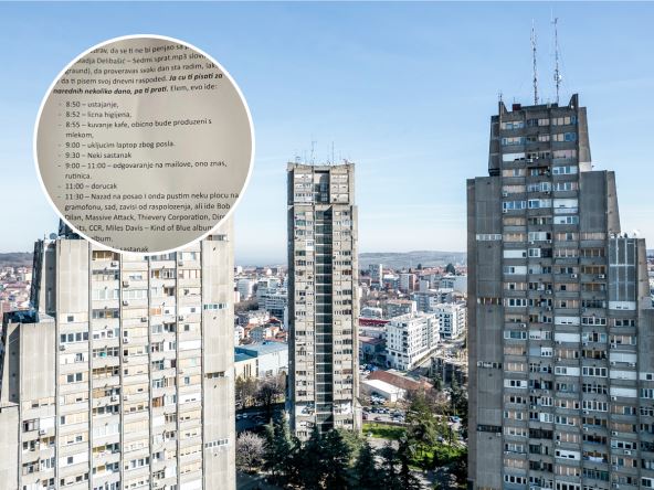 "E komšo pozdrav, da se ti ne bi penjao sa petog na sedmi sprat, da proveravaš svaki dan šta radim, lakše mi da ti pišem svoj dnevni raspored. Ja ću ti pisati za narednih nekoliko dana, pa ti prati."