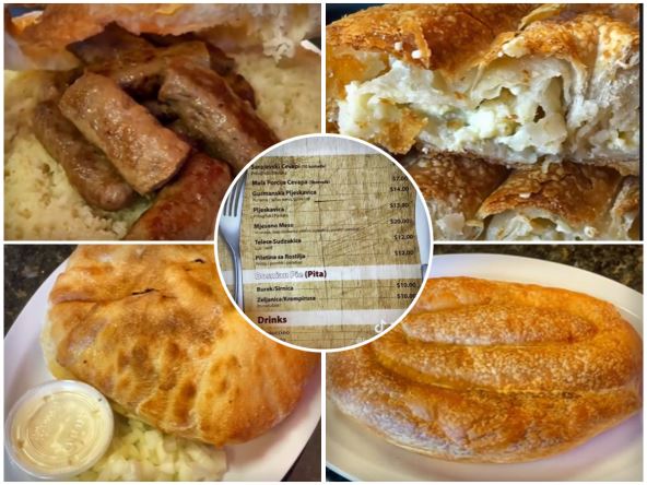 Na njemu se jasno vidi da porcija sa deset ćevapa košta 12 dolara, što otprilike iznosi oko 1.300 dinara, dok mala porcija ćevapa košta 7 dolara, odnosno skoro 800 dinara. Pita sa sirom i burek koštaju po 10 dolara, odnosno nešto više od 1.000 dinara. Na meniju se nalaze standardna i gurmanska pljeskavica, a od pita se mogu poručiti zeljanica i krompiruša. Za desert se služi popularna urmašica.