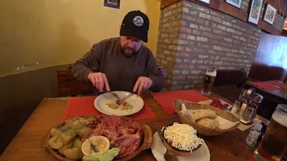"Ne znam šta da očekujem, ovo je nešto novo. Sedam sati se spremalo. Ovo je unikatni ukus, stvarno je ukusno. Ovo je nešto drugačije i nešto što bih preporučio svima. Ako dođete na Frušku goru ovo obavezno probajte. Hajde da vidimo i krompir. Baš je kremast. U kombinaciji sa mesom, odličan ukus", istakao je on i nije krio oduševljenje. Naručio je u jednom restoranu ribu i riblji paprikaš.