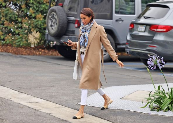 Ovoga puta Megan je viđena na ulicama Santa Barbare u Kaliforniji, gde se par preselio nakon žestokih svađa u kraljevskom domu. Paparaci su je uslikali u vrlo svedenom jesenjem stilu, s obzirom da su u tom delu hemisfere tempereture opale.