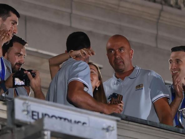 Jelena Đoković pojavila se na balkonu zajedno sa našim košarkašima i Novakom Đokovićem, gde su dočekani ovacijama i pesmom.