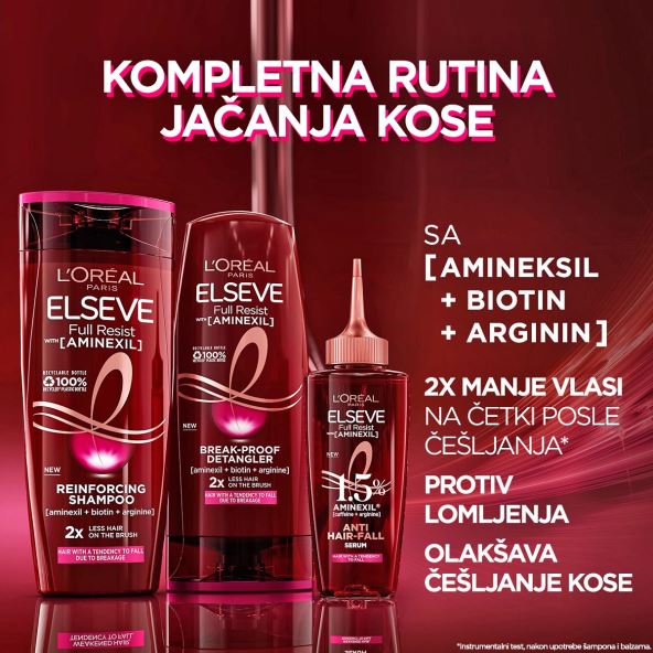 Prvi put od L'Oreal Paris-a pruženo je klinički dokazano naučno rešenje protiv opadanja kose i demokratizovano je za sve žene. Predstavljamo Elseve Full Resist serum protiv opadanja kose sa formulom koja sadrži 1.5% amineksila, kao i kofein i arginin, za manje vidljivo teme za samo 6 nedelja*.