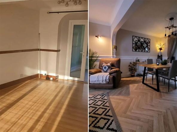 Kada je u pitanju pod, odlučila se za laminat koji ju je izašao manje od 400 evra i koji bio dovoljan da pokrije i pomoćnu sobu i hodnik. Iskoristila je i jeftini crni sprej da oboji ugrađena zidna svetla, kao i vrata i kamin. Glavni zid je ukrasila samoljepljivim ogledalima, a uz pomoć zavesa, tepiha i ukrasa osvežila čitav prostor.