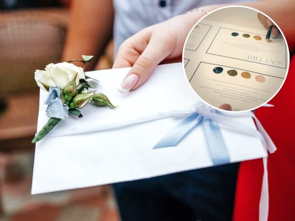 Njen budući muž je prikazan kako drži četkicu, oslikavajući šarene krugove na dnu pozivnice. U pitanju su palete boja koje gosti moraju da nose na njihovoj svadbi - svetlo roze, braon, bež i crna. Na taj način, mlada i mladoženja su zamolili svoje goste da nose odeću koja će biti u skladu sa nijansama njihovog venčanja.