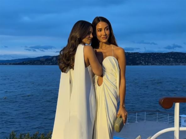 Jedno od prvih izdanja kojim se pohvalila je bela haljina neobičnog kroja. Prostire se do poda, ima tanke bretele i duboki dekolte koji je ključan detalj! Filip je nosio pantalone i sako u istoj nijansi, sa zanimljivim detaljima poput marame oko vrata i lanca na džepu od pantalona.