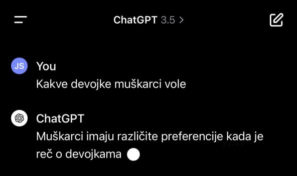 ChatGPT: Preferencije se razlikuju među pojedincima i ne postoji jedinstven odgovor. Ljude privlače različiti kvaliteti, kao što su ličnost, interesovanja i vrednosti. Od suštinskog je značaja da budete svoji i da se usredsredite na kvalitete koji vas čine srećnim i samopouzdanim.