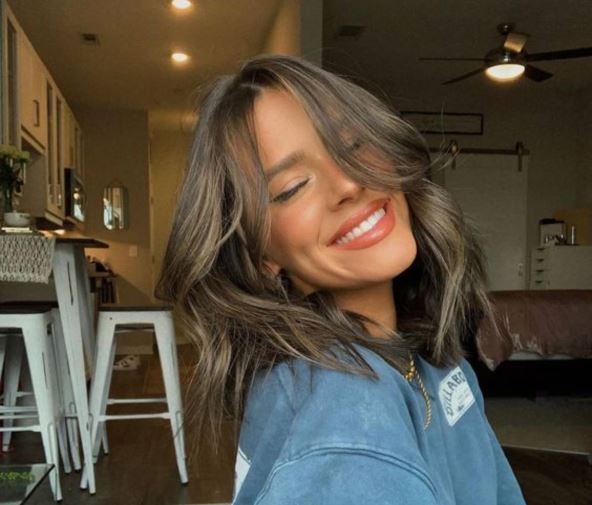 Ova frizura i dalje ima uvijeni oblik s razdeljkom na sredini, ali umesto da se spušta na jagodice, baby zavesa šiške padaju negde između iznad vrha obrva i gornjih trepavica. Kraća dužina dodaje malo oštrine, nalik pin-up estetici iz 70-ih, ali zadržava laskavi oblik.