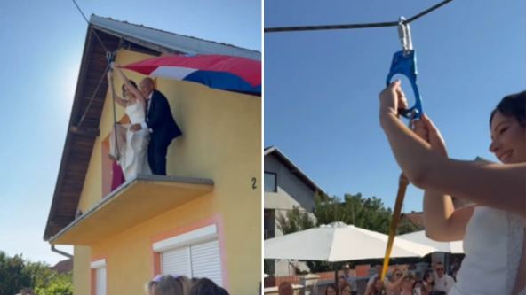 Umesto klasičnog ulaska, ona se vezala za zip-lajn i spustila sa balkona kuće pravo među svoje goste. Duga bela venčanica i visoke štikle nisu bile prepreka za ovaj hrabar potez koji je u sekundi postao hit na društvenim mrežama.
