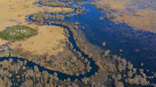 Iz vazduha, Hutovo blato izgleda kao pažljivo složen mozaik. Polja trske i šaša prelaze u tople nijanse žute i zlatne, dok se između njih presijavaju plava jezerca i uski kanali, poput ogledala razasutih po ravnici. Bez gustog letnjeg zelenila koje skriva detalje, zimski pejzaž ogoljava strukturu terena i naglašava kontrast između zemlje i vode. Upravo tada priroda pokazuje svoju geometriju, linije i oblike koje sa tla često ne primećujemo.