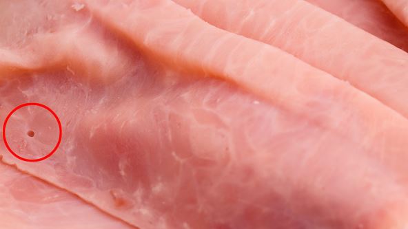 U mesnoj industriji, česta je praksa da se meso ubrizgava salamurama - mešavinom vode, soli i začina, koja poboljšava ukus, mekoću i sočnost suhomesnatih proizvoda. Ako se tečnost ne rasporedi ravnomerno ili se tokom procesa pojave mehurići vazduha, nakon sečenja šunke, oni mogu da budu vidljivi kao male rupice.