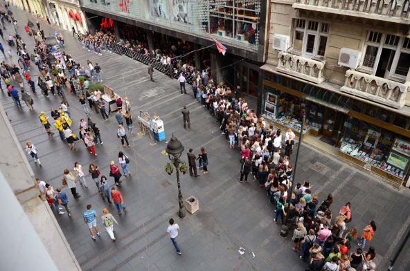 Uprkos tome što je radni dan nekoliko stotina ljudi, od đaka do penzionera, čekalo je ispred i pre nego što je radnja otvorena. Prodavnica u Knez Mihailovoj prostire se na tri sprata, na više od 2.270 kvadratnih metara, pa se "zmijica" ljudi duž ulice brzo preselila u samu prodavnicu. Za tili čas je bila dupke puna.