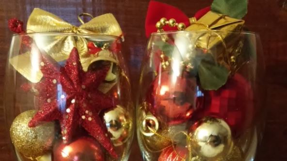 Za ovu dekoraciju su vam najpre potrebne dve staklene posude željene veličine, ili čaše za vino - izgledaće veoma elegantno. Sigurni smo da kod kuće već imate ukrase za jelku, a da biste napravili ovakvu dekoraciju, treba samo da nakite po svojoj želji stavite u čašu.