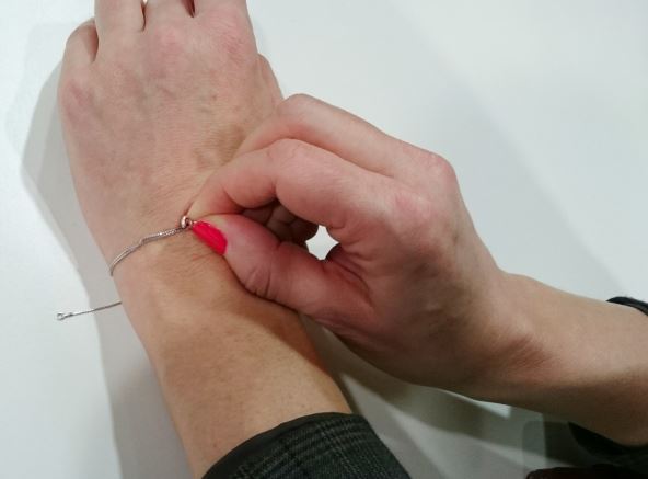 Drugi kraj, na kojem se nalazi kopča, uhvatite noktima ili prstima, privucite delu koji je zalepljen i zakopčajte sami, bez muke, svoju narukvicu.