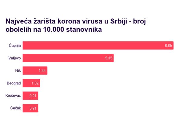 Ali podaci prikupljeni do 25. marta u 15 časova pokazuju da je najveće žarište, gledano isključivo sa statističke strane odnosno po broju obolelih na 10.000 stanovnika, zapravo Ćuprija.