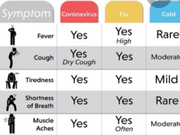 Groznica, čest simptom, izraženija je kod gripa nego kod korone, dok se retko se javlja kod prehlade. Suv kašalja je karakterističan za koronu, ima ga i kod gripa, dok je srednje jačine u slučaju prehlade...