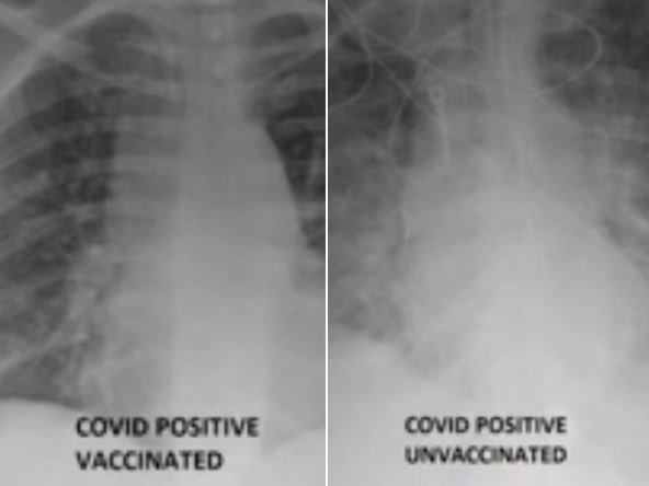 "Pluća bi trebalo da budu puna vazduha, i vazduh na rendgenu izgleda crno. Ako pogledate, videćete da je snimak nevakcinisanog pacijenta mutan, više beo nego crn. To znači da bi taj pacijent morao na kiseonik, i možda i više od toga, možda bi morao na veštačku ventilaciju, respirator i druge sisteme za održavanje vitalnih funkcija na veštački način", rekao je on za Si-En-En.