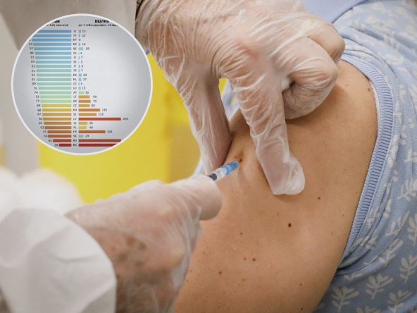 Evropska komisija je objavila grafikon zasnovan na podacima Evropskih centara za zarazne boelsti (ECDC) koji pokazuje odnos vakcinisanih i umrlih u zemljama Evropske unije. Podaci o vakcinaciji odnose se na punoletne građane, odnosno sve starije od 18 godina. Podaci o umrlima odnose se na period od 14 dana u novembru.