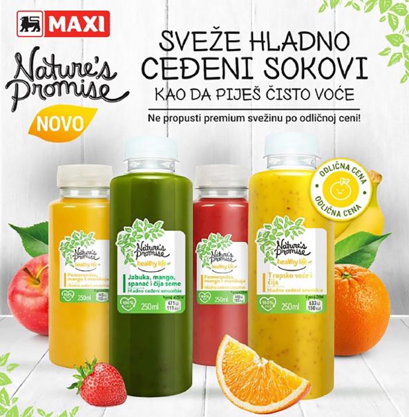 Najnoviji dodatak asortimanu „Nature's Promise“ su hladno ceđeni sokovi koji čuvaju originalnu svežinu i hranljivost voća. Proizvedeni kroz proces sporog ceđenja na temperaturi od svega 4°C, zadržavaju autentičan ukus i boju voća, bez primene pasterizacije. Ovaj metod omogućava očuvanje svih vitamina, minerala i enzima, obezbeđujući kupcima potpuno prirodne sokove na dohvat ruke.