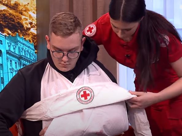 "Dalje moramo da učinimo taj deo nepokretljivim. Osim što pomeranjem izaziva bol, svako dalje pomeranje može da ošteti meka tkiva koja se tu nalaze. Kada nemate maramu, naša preporuka je da otkopčate jaknu i ubacite ruku. Na taj način ćete obezbediti mirovanje. Zaustavljamo krvarenje, sprečavamo mogućnost nastanka infekcije i postavljamo osobu u mirovanje", objasnila je Bojana.