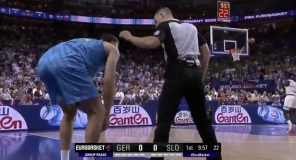 Zvuči neverovatno, ali je istinito. U momentu kada je naturalizovani slovenački reprezentativac skočio za loptu, sudija koji je podbacio nije se pomerio, on je u padu stao na njegovu nogu i tom prilikom izvrnuo skočni zglob. Odmah je odskakutao van parketa držeći se za nogu. Arbitri su prekinuli meč, čak su i protivnički igrači bili u čudu, jer nisu svi videli šta se tačno dogodilo.
