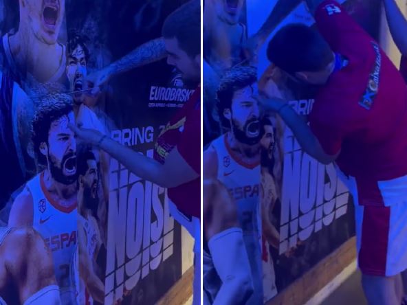 Dvojica španskih košarkaša vide se kako makazama seku lik Serhija Ljulja, kako bi u svlačionici mogli da se fotografišu sa njim. Iako nije bio u Berlinu kada se osvajala zlatna medalja, Realov bek bi na taj način bio deo zajedničke fotografije na kojoj su zlatni momci sa Evropskog prvenstva i njegova silueta. Pogledajte kako je to izgledalo: