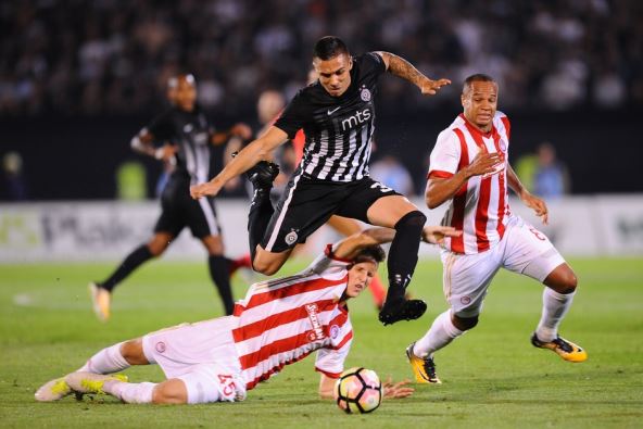 Olimpijakos je poveo iz druge šanse na meču, posle već druge greške u odbrani crno-belih, već u 5. minutu, ali je Partizan uspeo brzo da izjednači i popravi atmosferu na stadionu.