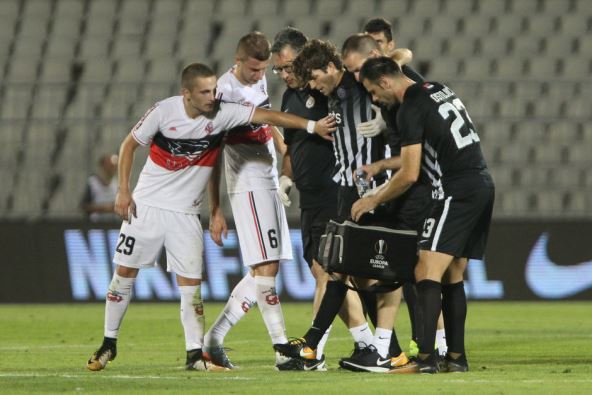 Vezni fudbaler Partizana je sredinom drugog poluvremena prilikom klizećeg starta i duela sa protivničkim fudbalerom ostao da leži na zemlji.