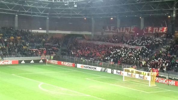 "Hiljadu doživotnih da su ti dali častan Srbin tebe slavi", istaknuto je pre utakmice BATE - Zvezda na delu tribine gde su stajale pristalice gostiju.