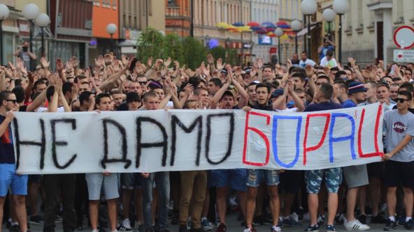 Navijačka grupa "Lešinari" poručila je da neće dozvoliti gašenje kluba, a skandirano je i ime Borisa Raspudića, bivšeg kapitena kluba koji je tokom protekle sezone oteran iz Borca.