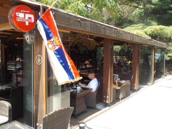 Navijači "orlova" u Baru nisu propustili priliku da označe poziciju na kojoj se nalaze, pa su tako u kafeu "Gvardija" na šetalištu Kralja Nikole, okačili srpski barjak.