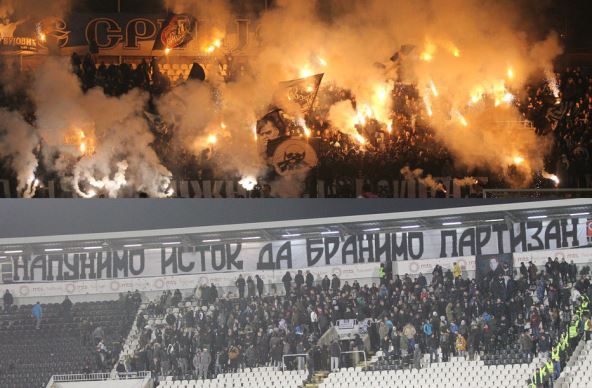 Frakcija Grobara na južnoj tribini je u 20. minutu napravila veliki vatromet, dok su navijača Partizana popalili dimne bombe i baklje, a zbog nekoliko ubačenih na teren i utakmica je bila prekinuta. "Partizanovci" su imali i poruku za ostale navijače pred "večiti derbi", ali i ostale mečeve u sezoni: "Napunimo istok da branimo Partizan"!