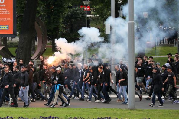 Navijači Crvene zvezde i navijači Partizana, ali u tri različite kolone, stigli su svako na svoju tribinu Stadiona "Rajko Mitić" na kom će ovog četvrtka uveče biti odigrano veliko finale fudbalske sezone u Srbiji.
