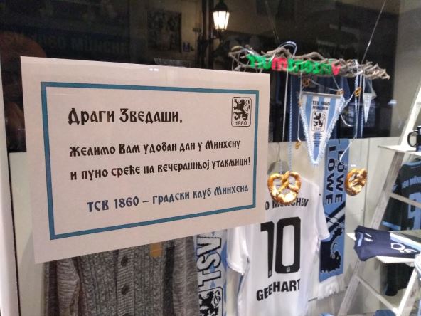 "Dragi zvezdaši, želimo vam udoban dan u Minhenu i puno sreće na večerašnjoj utakmici. TSV 1860 - gradski klub Minhena", istaknuto je u izlogu prodavnice plavo-belih, osnovanih pre 159 godina, odnosno 40 pre Bajerna!