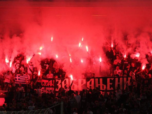 Navijači crveno-belih, koji se nalaze na severnoj tribini, napravili su bakljadu pre početka drugog poluvremena. Mnogo baklji je uletelo na atletsku stazu...
