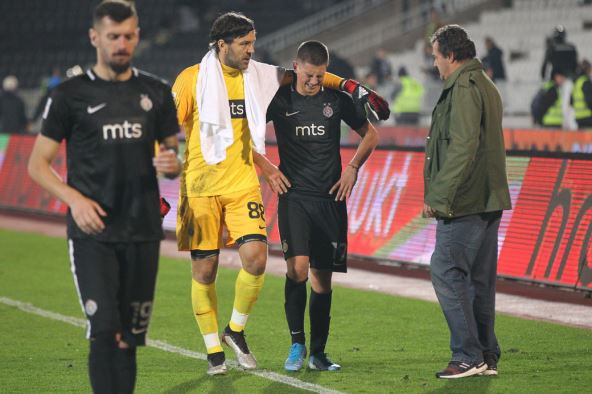 Posle meča, Partizanov golman tešio je mlađeg saigrača Zlatana Šehovića, koji je kiksnuo pre gola "zmajeva" za 1:2.