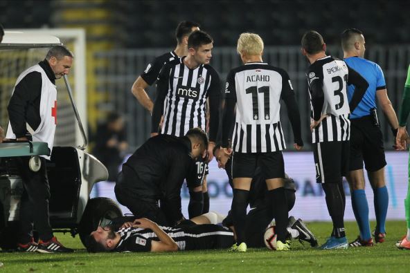 Crnogorski reprezentativac u dresu Partizana bio je jedan od najboljih do 59. minuta prvenstvene utakmice protiv Inđije (3:0), kada je posle duela na sredini terena ostao da leži na travi držeći se rukama za glavu.