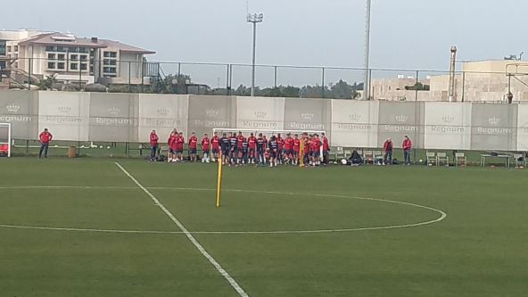 Igrači su izašli na teren hotela "Regnum" u 11 časova, svi osim Dušana Jovančića koji ima temperaturu, dok je Nemanja Milunović trenirao odvojeno od ostatka tima, lagano trčeći krugove oko terena.