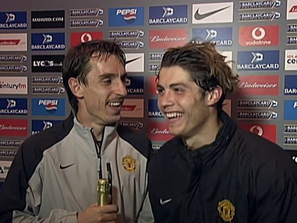 Ronaldo je iza kamere bio stidljiv, ali mu je Nevil mahnuo u stilu "ti, ti, dođi ovamo!", da bi potom Portugalac pokušao da komunicira.