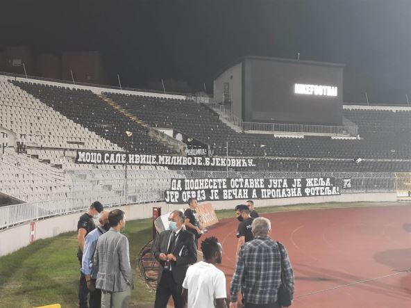 "Moco, Sale, Ivice, Milivoje, Bjekoviću... Da podnesete ostavke juga je želja, jer obraz je večan, a prolazna fotelja!", stoji u poruci navijača koja se odnosi na Momčila Vukotića, Sašu Ilića, Ivicu Kralja, Milivoja Ćirkovića i Nenada Bjekovića.